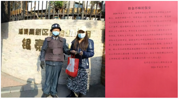 4月11日,市保安公司高新區(qū)銀泰城幼兒園項(xiàng)目部保安隊(duì)員王永上班路上撿到手提袋一個(gè),四處找尋無果后,打開查看包內(nèi)有手機(jī)和少量現(xiàn)金,通過電話聯(lián)系找到失主,最終歸還遺失物品。失主家人拿到失而復(fù)得的財(cái)物后,十分激動(dòng)并專門送上感謝信對(duì)其表示感謝。